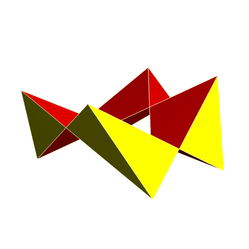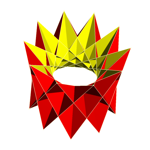 Crossed quadrilaterals can be arranged in a way, that 3-dimensional figures result which look like crowns. These are called crown polyhedra. Their construction is possible, if you take prisms or antiprisms as a basis, the vertices of which are connected by the edges of the crossed quadrilaterals. Crown polyhedra have rotational symmetry, depending from that of the basic prism. Here are some examples: