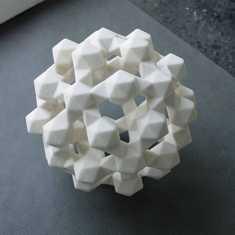 Dr. Lordick had a lot of work processing the data for the printer and he took the photo when the work was done. I'd like to express my thanks to him! In this gallery there are numerous virtual models which were constructed in the same way. They are arrangements of octahedra or (distorted) prisms with icosahedra or tridiminished icosahedra (Johnson-solid No. 63). Manifold rings or cages are available. If you take frustums of pyramids instead of prisms or octahedra, spirals result. All models were constructed with Great Stella. |