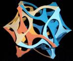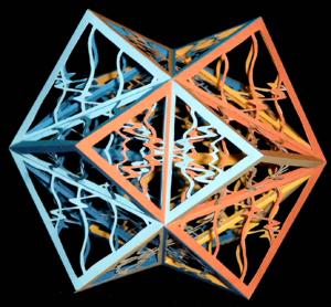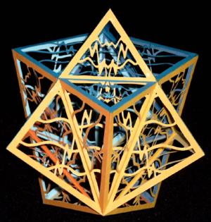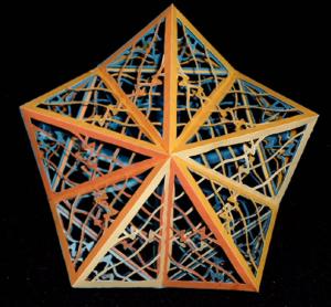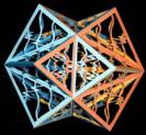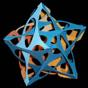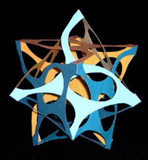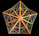 Ce polyèdre est fait de dix faces quadrilatères. En cas du modèle en bas, les bords sont laissés tombés partiellement. 6 de ces decaèdres sont une stellation du pentakisdodecahedron, le dual de l'icosaèdre reccourci. Il y a des VRML et des .STEL-files de cette stellation. Ce modèle a été fait du programme Great Stella . Avec ce programme on peut ouvrir le STEL-files. |