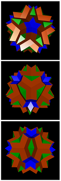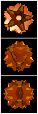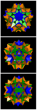 Les 120 bords du gaddid (grand dodecicosidodecaèdre) peuvent être connectés par des pentagrammes (nombre première), des triangles (deuxième nombre), des decagrammes (troisième nombre) et des carrées (quatrième nombre). En cas du gaddid il y a seulement 20 triangles, 30 carrées et 12 pentagones. 30 polyèdres sont possibles. Il y a 10 figures pyramidales et 3 antiprismatiques avec une axe de rotation 3-fois autant et 11 pyramidales et 3 antiprismatiques avec une axe de rotation 5-fois. Trois polyèdres sont icosaédrals. Ce sont le grand rhombidodecaèdre (gird), le grand rhombicosidodecaèdre (qrid) et le gaddid lui même. |