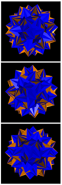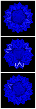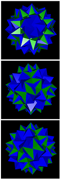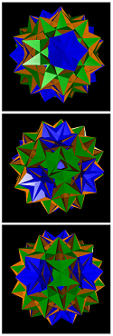 Le gidrid (grand dirhombicosidodecaèdre) contient 24 pentagrammes, 40 triangles and 60 carrées. Sa symétrie est icosaédral. Les bord du gidrid peuvent être connectés par des pentagrammes (nombre première), des triangles (nombre deuxième) et des carrées (nombre troisième). Comme ça, un grand nombre des polyèdres est possible. La groupe avec une axe de rotation 3-fois autant contient 117.800 non-compound facettes. C'est pour ça que Klitzing ne l'a pas analysé en détail. Dans la groupe icosaédrale, il y a 2 figures. Ce sont le le gisdid (grand dodecicosidodecaèdre émoussé) et le gidrid. Pour montrer les relations avec d'autres groupes de symétrie, le compound de 20 octaèdres et le compound de 20 thah's (thah = tetrahemihexaèdre) sont énoncés aussi. Le thah est l'octaèdre sont les seuls non-compound facettes du gidrid avec une axe de rotation 3 fois autant qui n'ont pas de pentagrammes. Enfin, dans la groupe axial 5 fois autant, il y a 15 polyèdres antiprismatiques, 9 antiprismatique-chirals, 10 avec une symétrie pyramidal-nonchirale, 120 avec une symétrie de reflection rotationale, et 250 avec une symétrie pyramidal-chirale. On peut voir que tous les facettes 5 fois autant ont tous les 24 pentagrammes. |