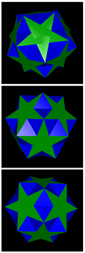 Le Sidtid (petit icosidodecaèdre ditrigonal , sid-12-20-0-0) est fait de 12 pentagrammes et 20 triangles. Il y a 6 axes de rotation 5 fois autant et 10 axes 3 fois autant. Les bords du sidtid peuvent être connectés par des pentagrammes (première nombre), des triangles (deuxième nombre), des carrées (troisième nombre) et des pentagones(quatrième nombre). 159 polyèdres sont crées, qui sont groupés comme ça: 46 polyèdres pyramidals et 7 antiprismatiques ont une axe de rotion 5 fois autant, 76 figures pyramidales et 7 antiprismatiques ont une axe 3 fois autant. En plus, il y a 22 figures chirales avec une axe 3 fois autant dont 6 sont antiprismatiques et 15 sont pyramidales, un polyèdre est tetraédral-chiral. Le cube aussi est une facette du sidtid. Il y a 4 figures avec une symétrie icosaédrale. Ils sont la composition de 5 cubes, le grand icosidodecaèdre ditrigonal (gidtid), le dodecadodecaèdre ditrigonal (didtid) et le sidtid lui même. |